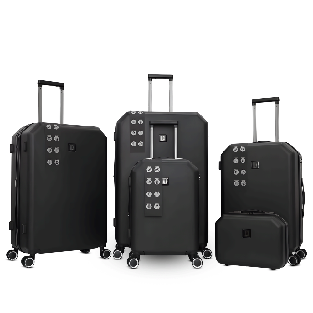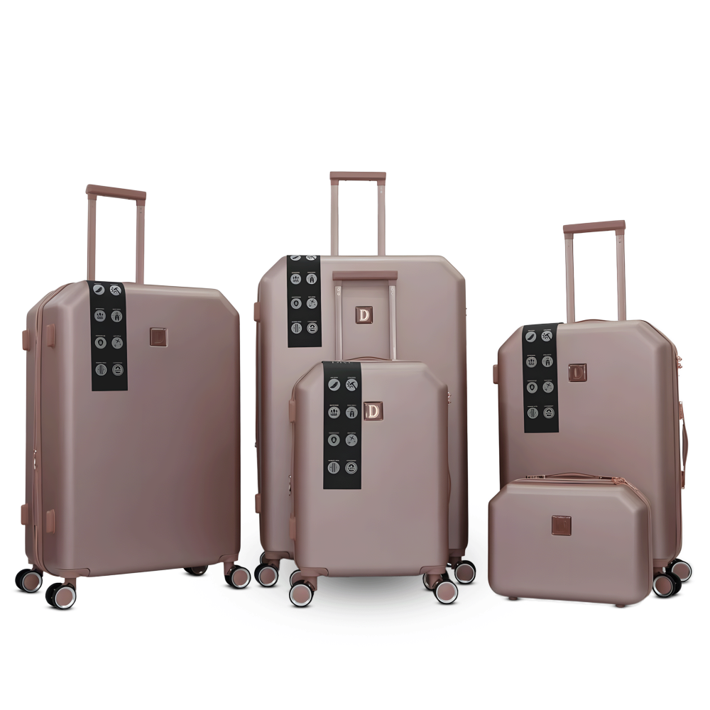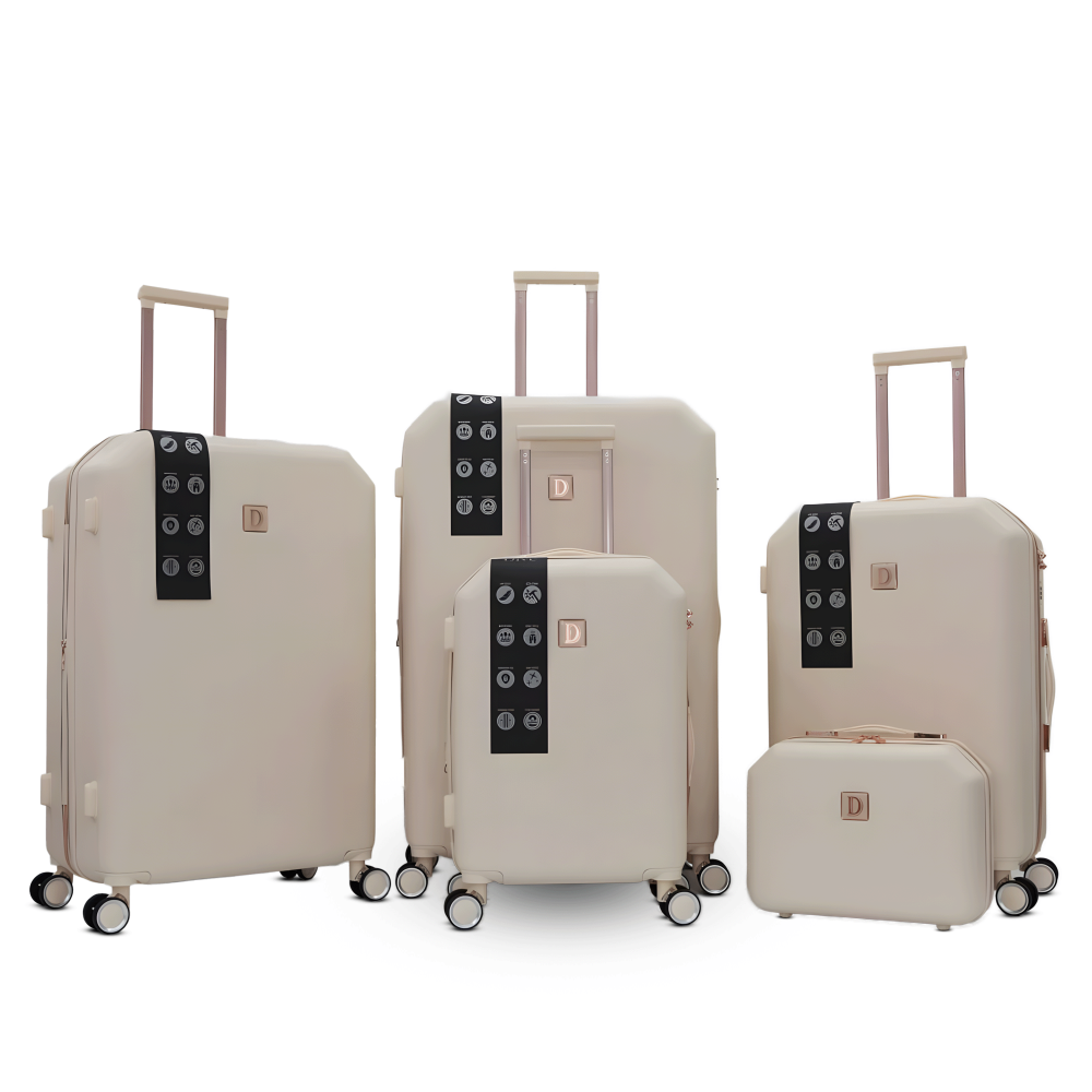يتكون من خمس مقاسات مختلفه: حقيبتين كبيره، حقيبة وسط، حقيبة مقاس الطائرة و حقيبة مكياج